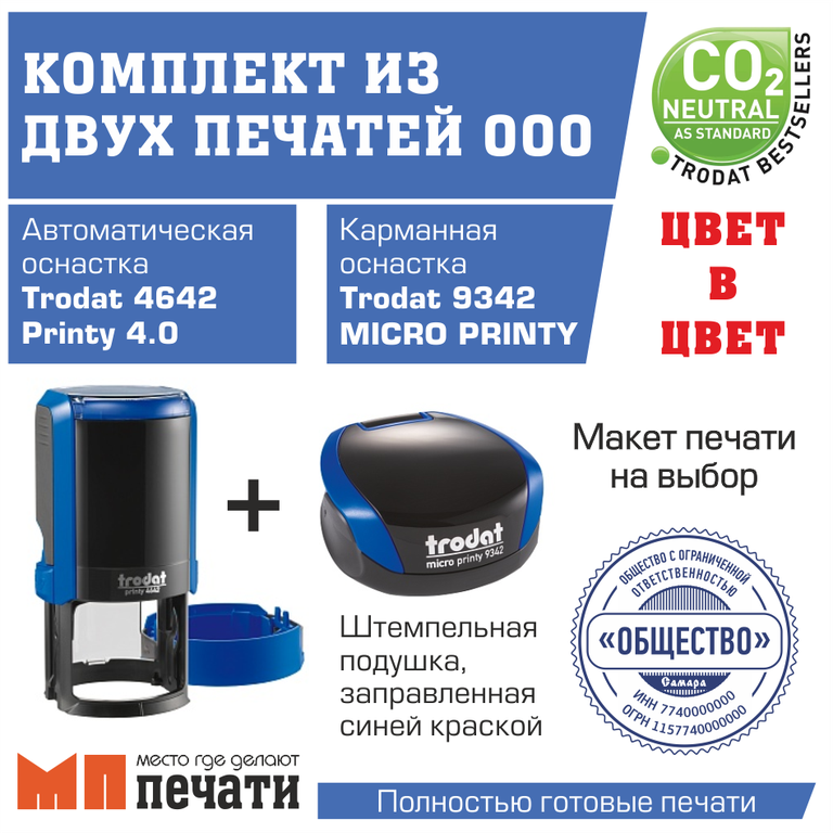 Печати и штампы ООО. Комплект из двух печатей ООО (автоматическая + карманная) цвет синий.