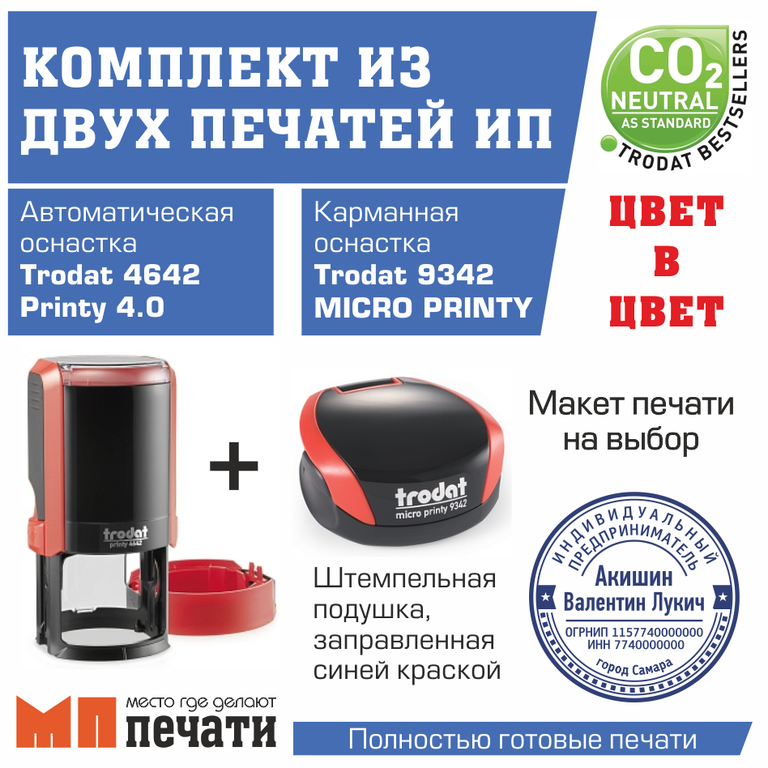 Сделать печать ИП. Комплект из двух печатей ИП (автоматическая + карманная) цвет красный