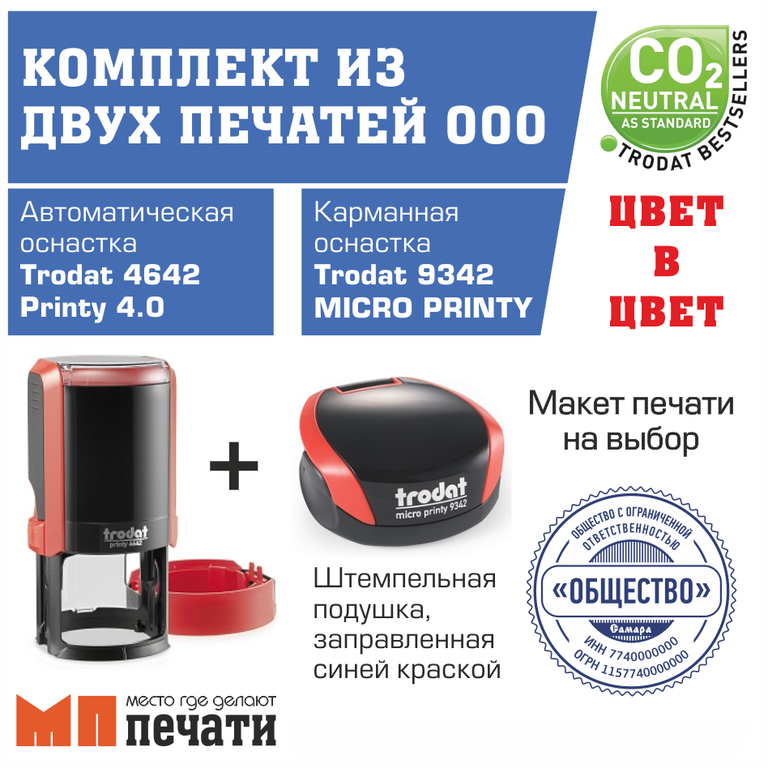 Купить печать ООО. Комплект из двух печатей ООО (автоматическая + карманная) цвет красный.