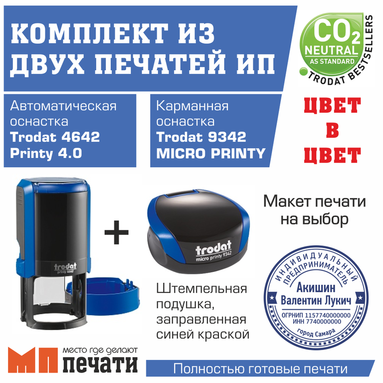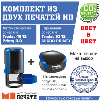 Печати и штампы ИП. Комплект из двух печатей ИП (автоматическая + карманная) цвет синий